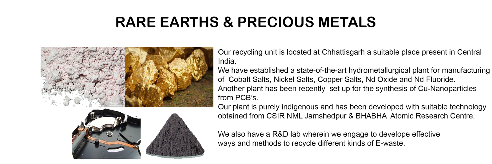 ADV Metal Combine Pvt. Ltd. an ISO 9001:2015 & ISO 14001:2015 organisation. We are a privately owned E-waste recycling company which aims to remove the complexity out of the process of electronic assets management & recycling. We expertise in providing simple, straightforward, transparent and sustainable way to recycle and manage e-waste and electronic assets. At ADV E-Waste is disposed of following the strict guidelines of Chhattisgarh Environment Protection Board (CECB), and Central Pollution Control Board (CPCB) and considering all hazards of Health Safety Environment (HSE). Sustainability, resource scarcity, environment pollution are the key pillars and issues which made us come into this sector. Our company believes on few basic principles, they have guided us in our journey these are: 1) To be technologically sound, 2)ensure safety of all at any cost and 3)to be innovative and cost effective at every stage. Our collaboration with CSIR-NML Jamshedpur for the development of a technological process for recovery of Cobalt, Lithium, Nickel from discarded Li-ion batteries is now successfully developed and has been implemented. We have also successfully implemented the process designed by the BHABHA Atomic Research Centre for the synthesis of Copper Nano Particles from Depopulated Printed Circuit Boards.